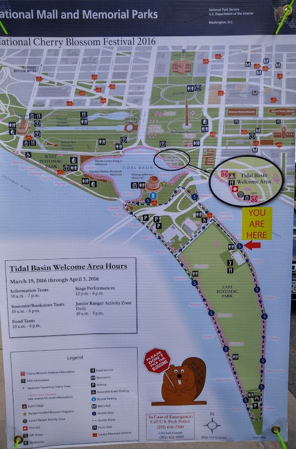 看樱花的最佳地点如下图所示。Tidal Basin 湖一圈和杰弗逊纪念堂附近是最壮观的,此外就是East Potomac Park岛里面Ohio Dr SW 路两边。