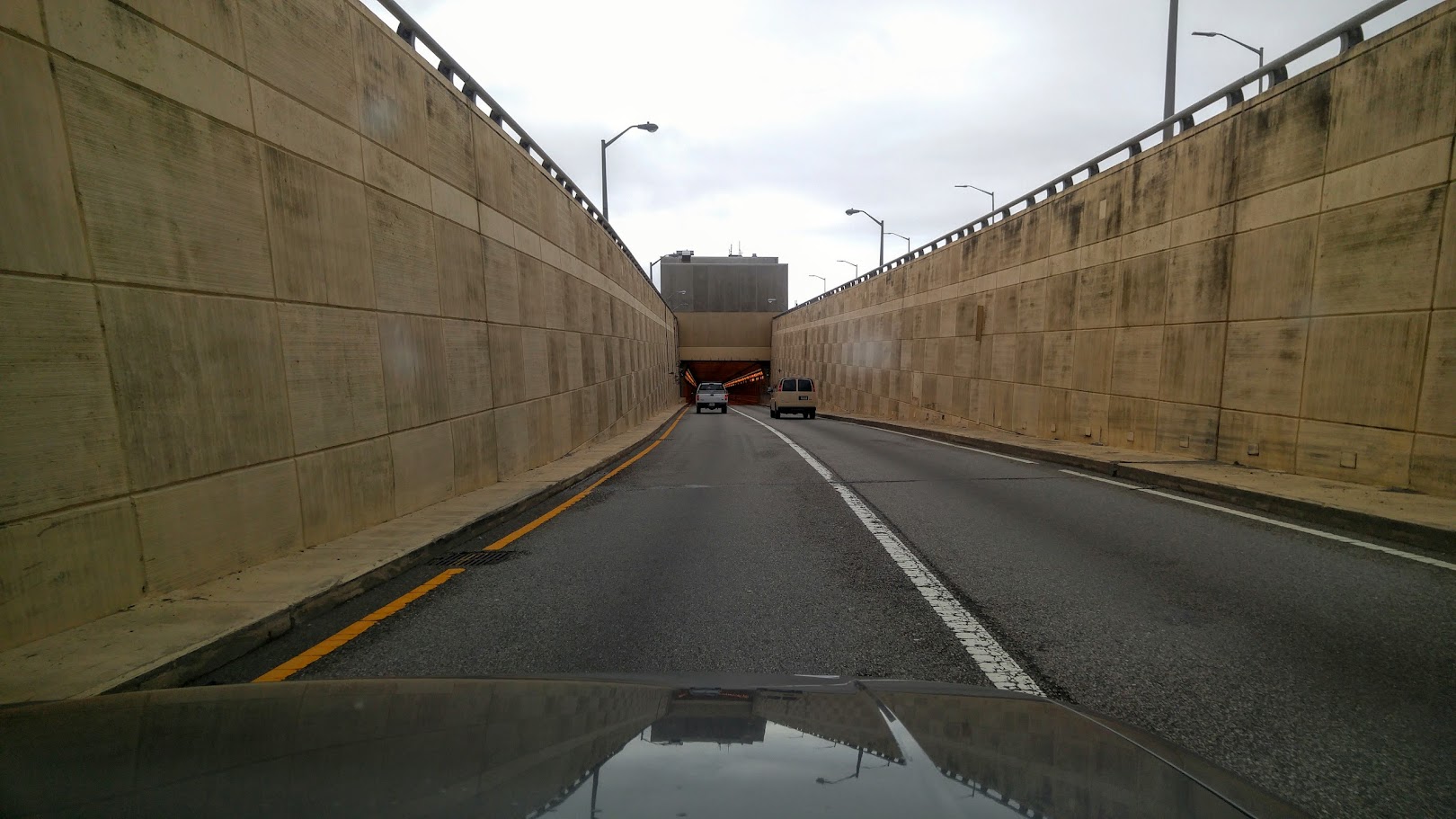 在桥上开着开着就到了隧道,出来后又是桥。要挖隧道的原因是因为港口的舰船要经过,桥都建得很低,无法通过。
