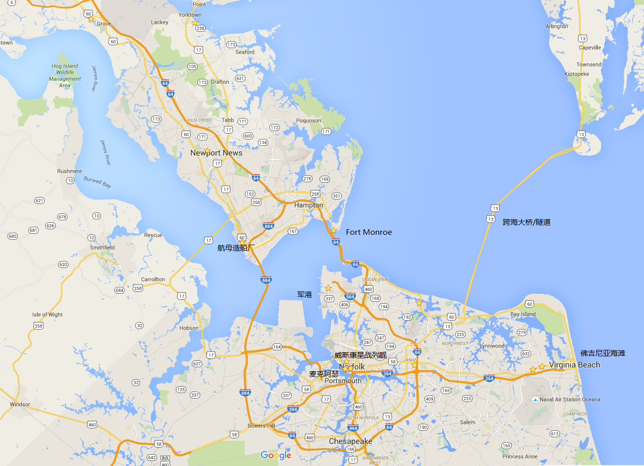 Norfolk 离威廉斯堡不到一个小时,首先要经过纽波特纽斯 Newport News,这里有现在美国唯一造航空母舰的船厂。