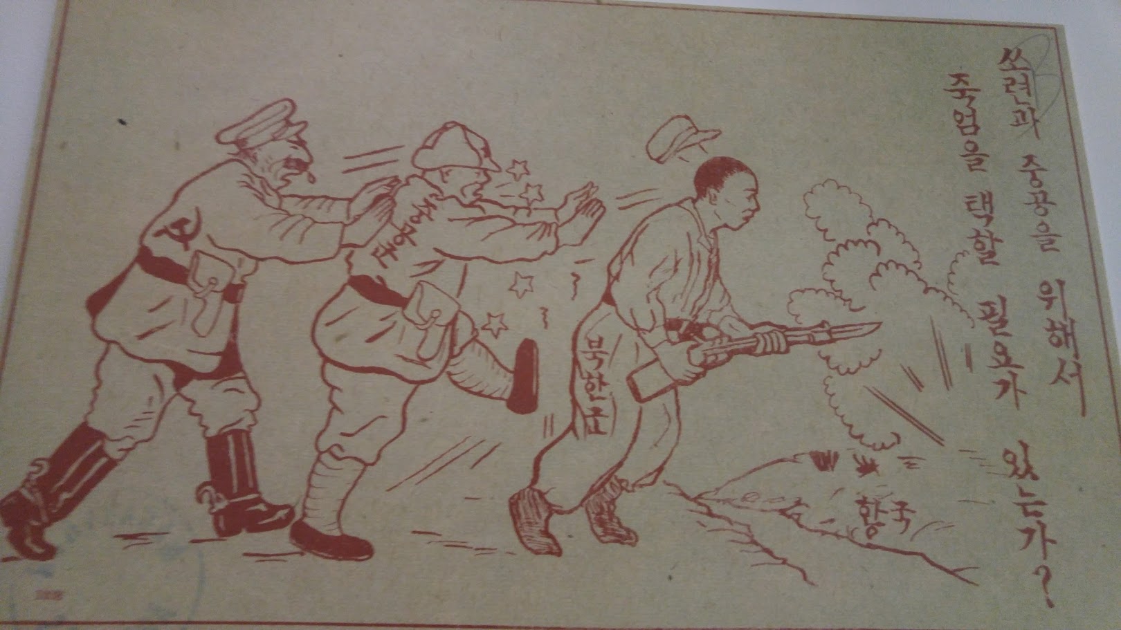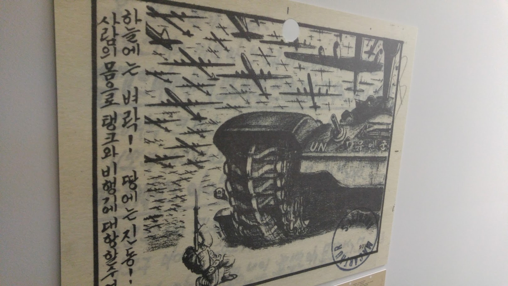 馆内有不少韩战时南朝鲜的漫画,从另外一面看韩战挺有意思。这幅画是说北韩和中国在联合国面前是螳螂挡车,自不量力。