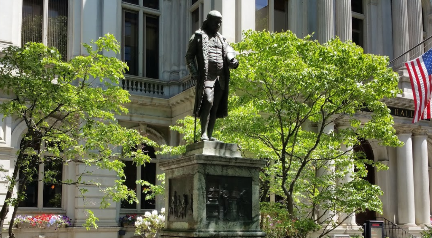 本杰明·富兰克林生于波士顿,所以在 1856 年在老市政厅 Old City Hall 前面为他建立了一尊铜像。下图是老市政厅,右下角便是铜像。