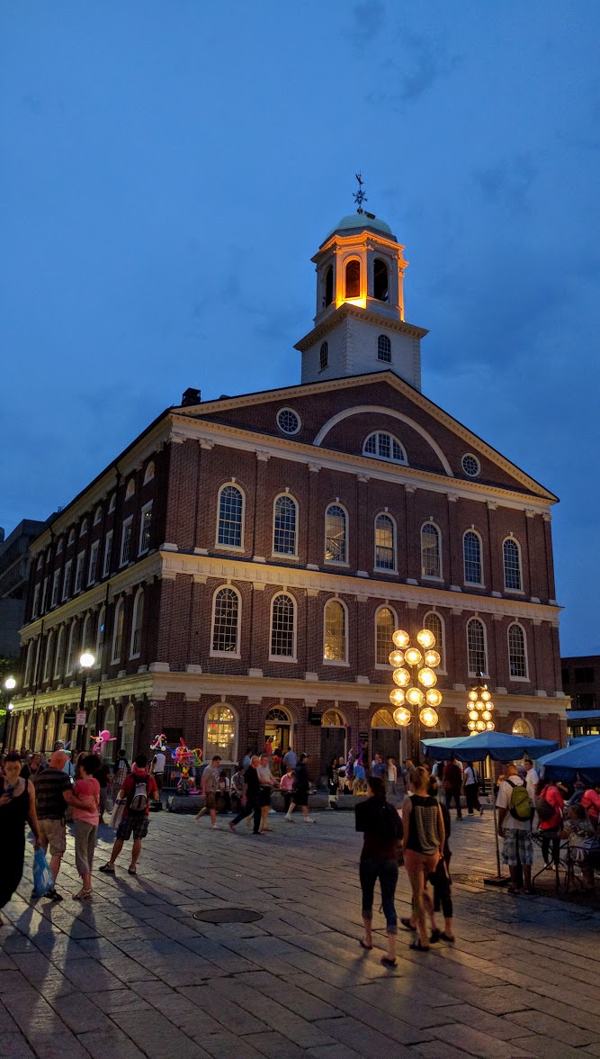 法尼尔厅 Faneuil Hall 是由富有的商人皮特法尼尔 1741 年出资修建的一个用作室内市场的大楼,后来成了独立运动组织“自由之子”聚会的场所,塞缪尔·亚当斯 Samuel Adams 常常在这里发表演讲,宣扬脱离英国独立,在美国独立运动中起了重要的作用。所以这栋大楼也被称为“自由的摇篮” Cradle of Liberty,也被称为“自由言论之家” the home of free speech。