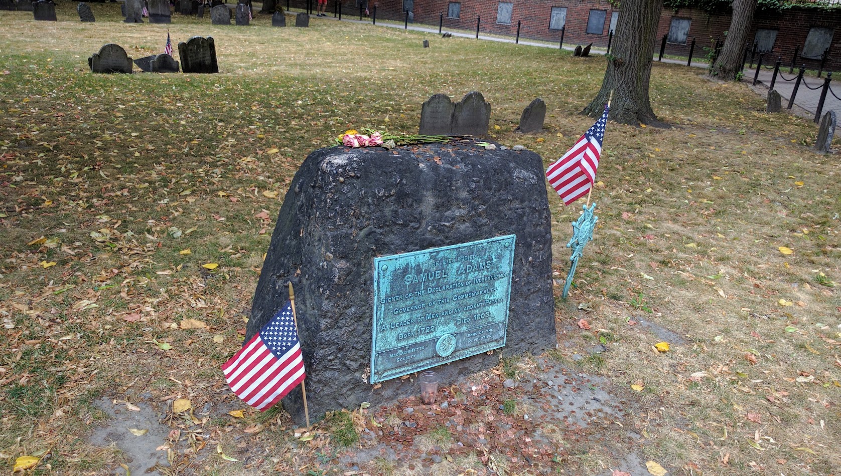 塞缪尔·亚当斯 Samuel Adams 的墓碑,他是美国独立运动的领导人,波士顿茶党 Tea Party 的创建人,独立宣言的签署人之一。约翰汉考克初入政界时是他的门徒,后来两人因为政治见解不同而分道扬镳。