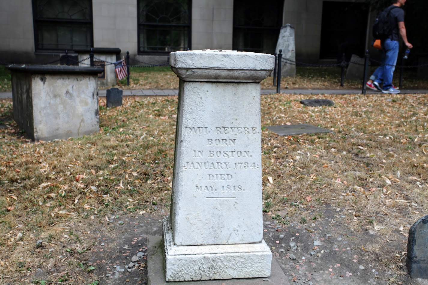 银匠和爱国者保罗·里维尔 Paul Revere 的墓碑。他在独立战争期间组织了一个监视英军东西的情报系统。他最有名的是午夜骑马狂奔 Midnight Ride 去通知约翰汉考克和塞缪尔·亚当斯Samuel Adams 和其他民兵英军要来抓捕,有一首歌唱到他骑马大喊英国人来了The British are coming。